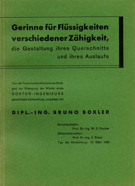 3. Gerinne für Flüßigkeiten verschiedener Zähigkeit, die Gestaltung ihres Querschnitts und ihres Auslaufs, Dissertation, vorgelegt der Technischen Hochschule Stuttgart bei Prof. Dr.-Ing. Walther E. Fischer am 12. März 1938